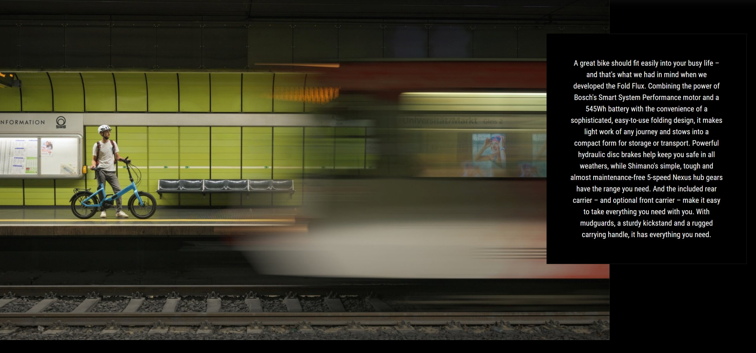 The point of a folding bike is to make your life easier. That’s why we equipped our Fold Flux with a comfortable, convenient carry handle located in a position that makes it easy to lift and carry the bike. Whether you’re taking it on public transport, carrying it up a flight of stairs or into the office, it’s the kind of detail that helps make the difference.