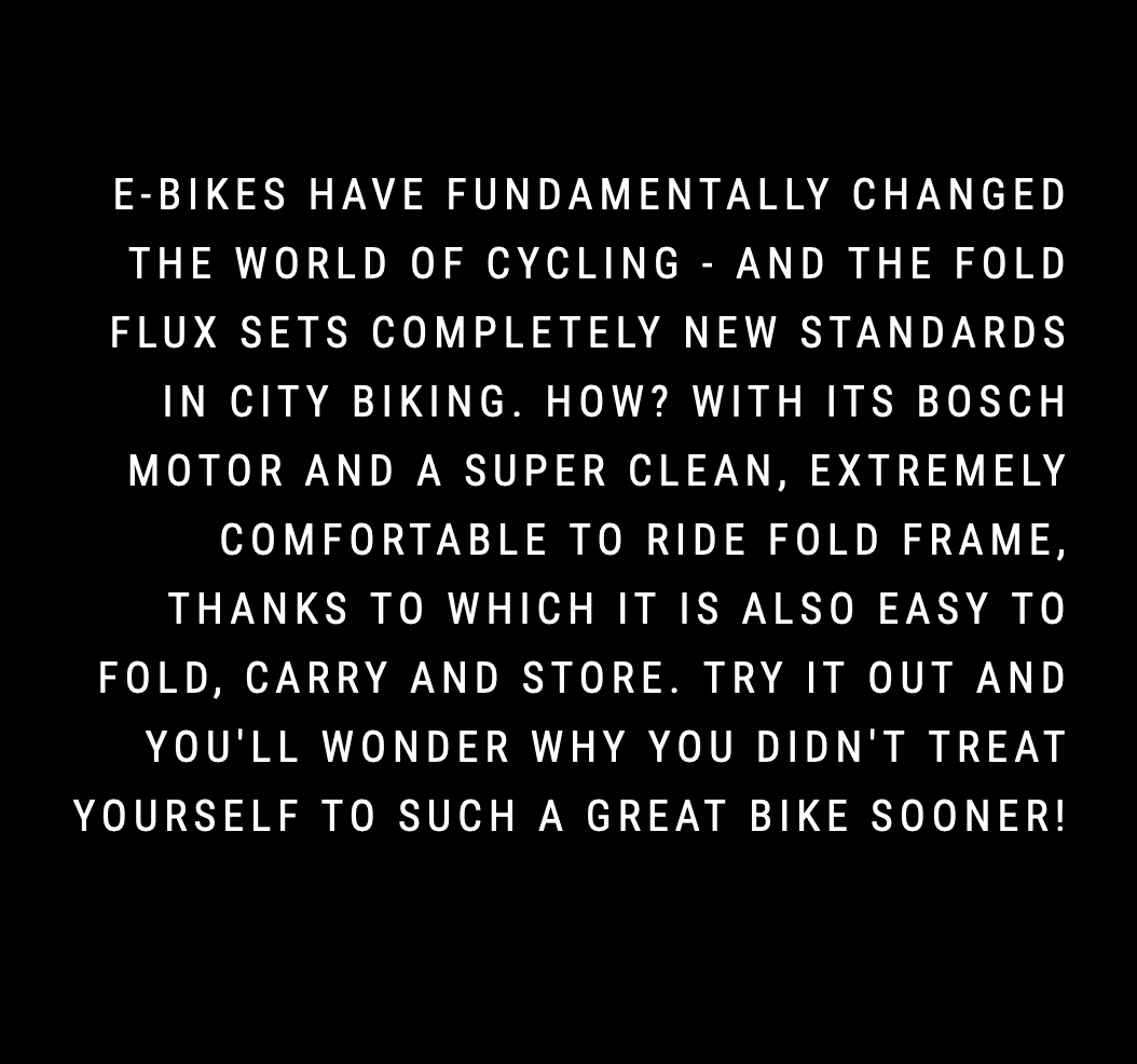 You want your folding bike to be simple to use, so we designed our Integrated Folding Technology to do just that. With the push of a button the Fold Flux can be transformed into an easy-to-carry, easy-to-store package with a conveniently placed carrying handle. Simple, flexible mobility, redefined.